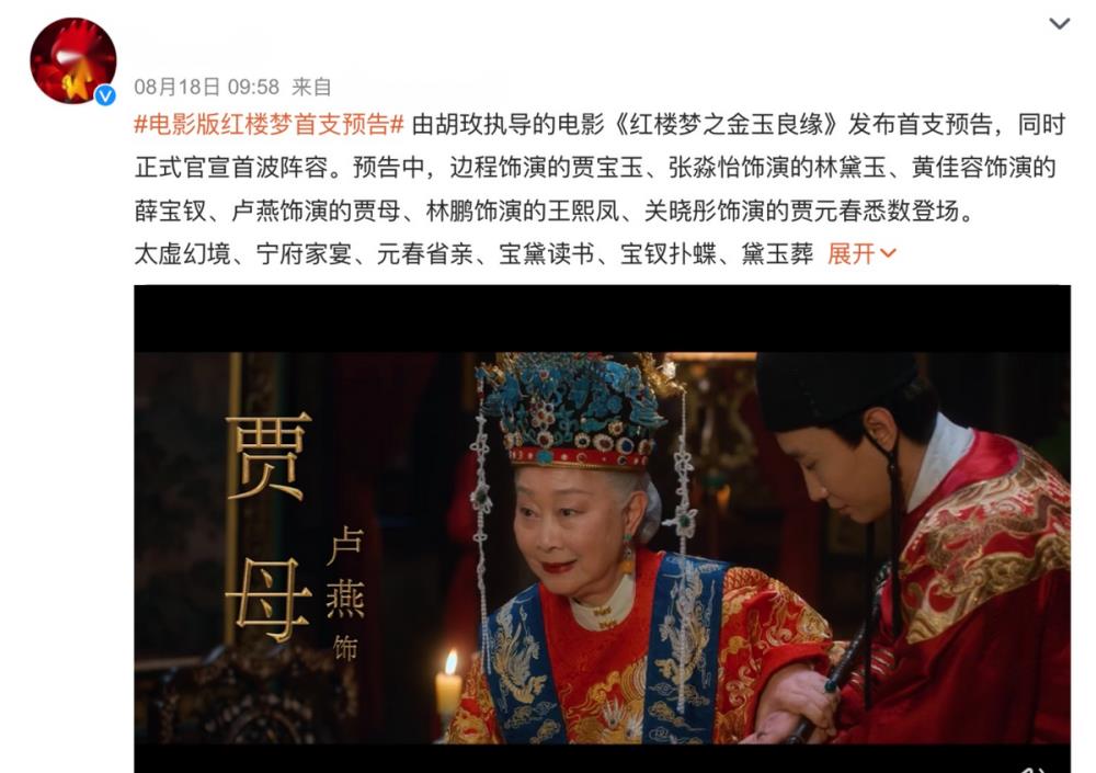 据悉,电影《红楼梦之金玉良缘》(以下简称“电影版《红楼梦》”)发布最新预告片,已正式进入预告阶段。